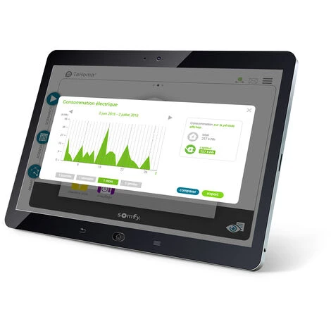 - Connecté à TaHoma, il vous permet de visualiser sous forme de courbes, sur votre smartphone, ou votre tablette, vos consommations électriques mesurées à la semaine, au mois ou à l’année et de faire des économies d’énergie.