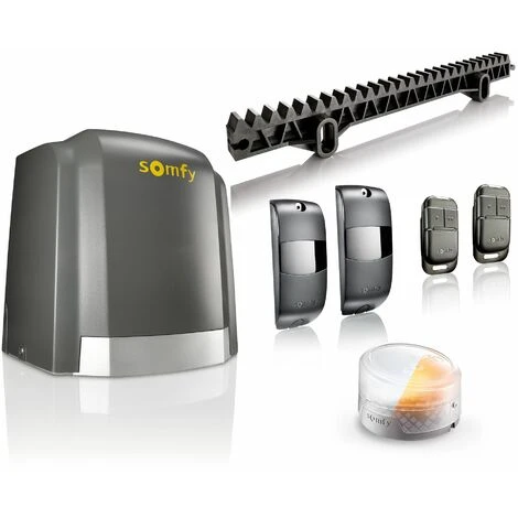 - Kit de motorisation pour portail coulissant incluant 1 moteur, 2 télécommandes 2 touches Keypop, 4 mètres de crémaillère de 20mm d’épaisseur (12 tronçons de 33cm), 1 gabarit de perçage, 1 feu clignotant, et 1 jeu de cellules photoélectriques.